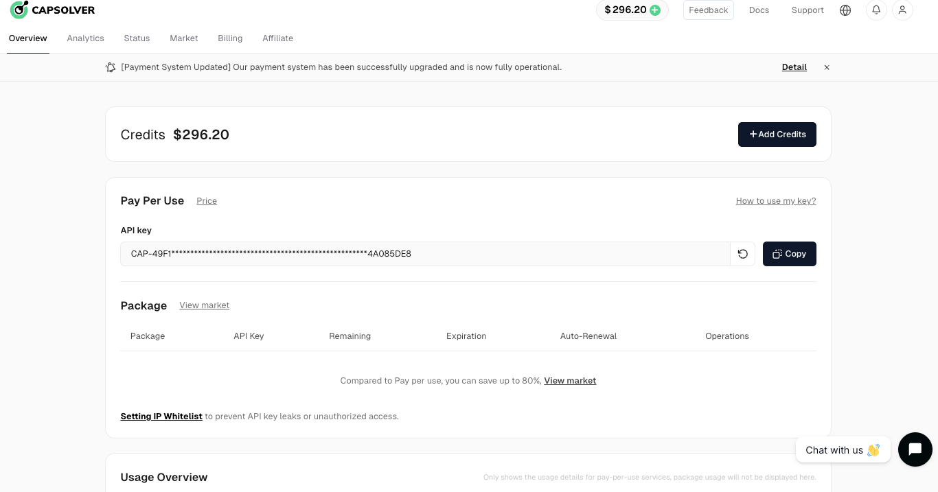 There are several CAPTCHA solving services available that can be integrated into your scraping script. Here, we will use the CapSolver service. First, you need to sign up for CapSolver and get your API key.