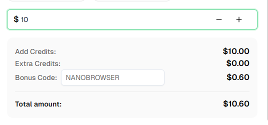 Ready to get started? Sign up for CapSolver and use bonus code NANOBROWSER for an extra 6% bonus on your first recharge!