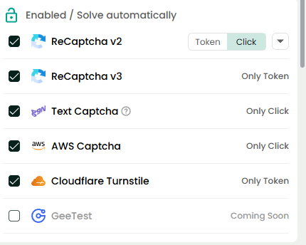 CapSolver supports reCAPTCHA v2 (image and invisible), reCAPTCHA v3, Cloudflare Turnstile, GeeTest, AWS WAF, and many more CAPTCHA types.