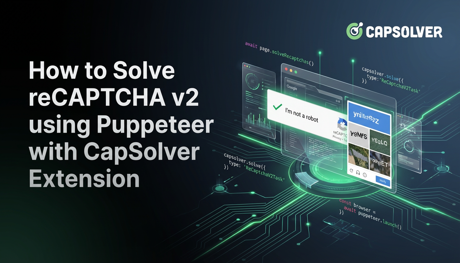 Aprende a resolver de manera fluida reCaptcha v2 con Puppeteer y la extensión de Capsolver, un guía detallado sobre cómo configurar y automatizar soluciones de captcha de manera efectiva.