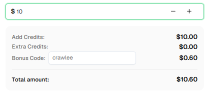 ¿Listo para comenzar? Regístrate en CapSolver y usa el código de bonificación CRAWLEE para obtener un 6% adicional en cada recarga!