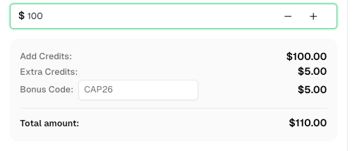 इसके अलावा, कैपसॉल्वर एक विशेष बोनस कोड CAP26 प्रदान करता है, जो हर रीचार्ज पर 5% अतिरिक्त बोनस देता है, कोई उपयोग सीमा नहीं है।
