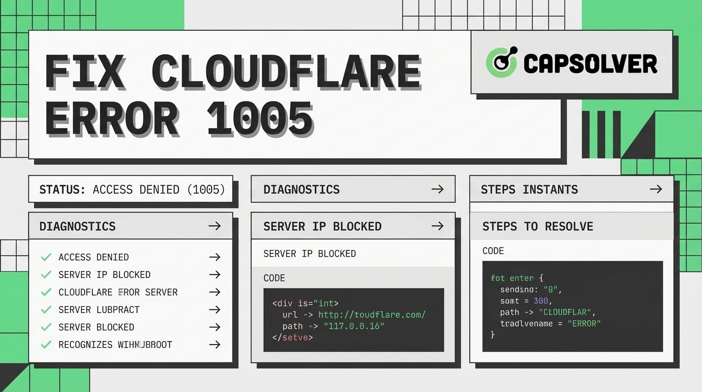 学习修复Cloudflare错误1005访问被拒绝的网络爬虫问题。发现解决方案如住宅代理、浏览器指纹识别和CapSolver验证码解决方法。优化您的数据提取。